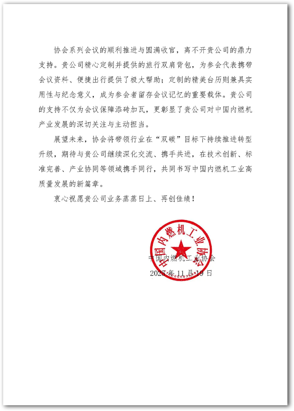 來自中國內燃機工業協會的感謝信