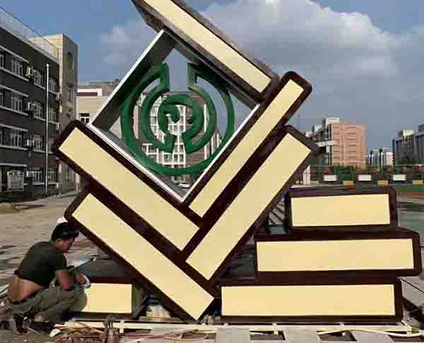 雕塑整體采用具象的常規書本造型,搭配所放置的學校校徽標志,突出學校的尚學、讀書分為,學習氣息濃厚十足。